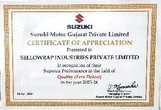 Suzuki Motor Gujarat Certificate of Appreciation (2024) - Superior Performance in Quality (Zero Defect, 2023-2024). | ![]() |